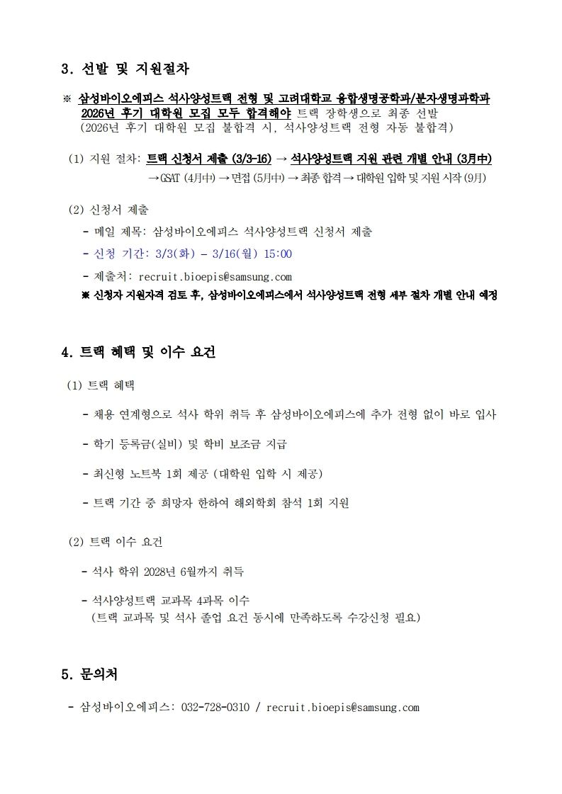 | 제목 | [기한: ~3/16(월) 15:00까지] [삼성바이오에피스] 2026년 후기 대학원 석사과정트랙 장학생 모집 공고 (수정사항 有) |